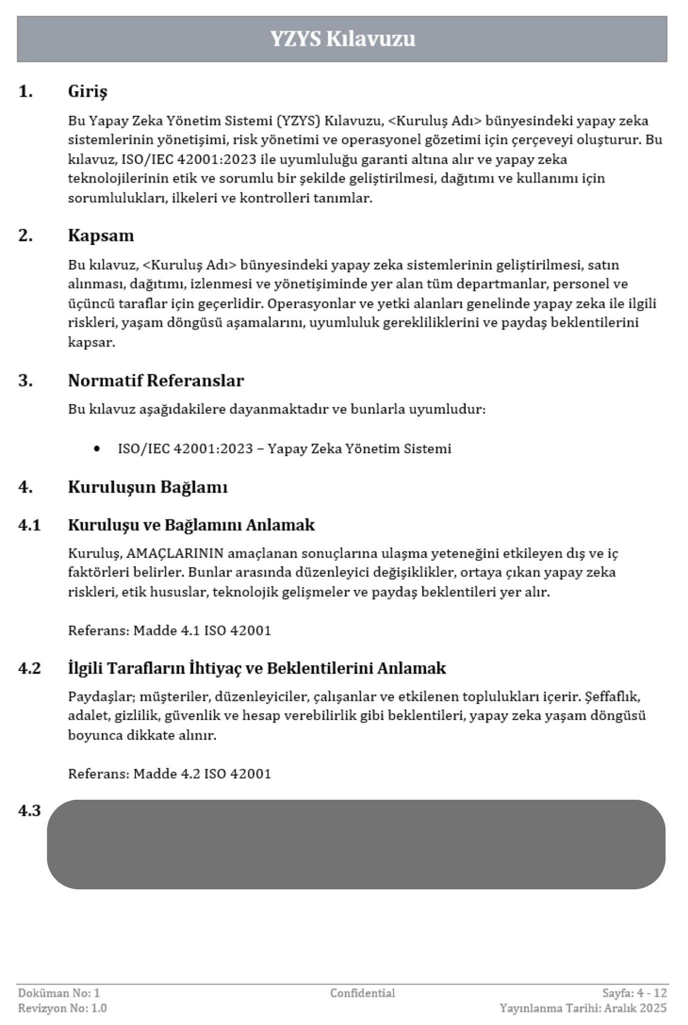 ISO 42001:2023 el kitabı, planı, politikası, prosedürleri, SOP’leri, formatları, denetim soru listeleri vb.,