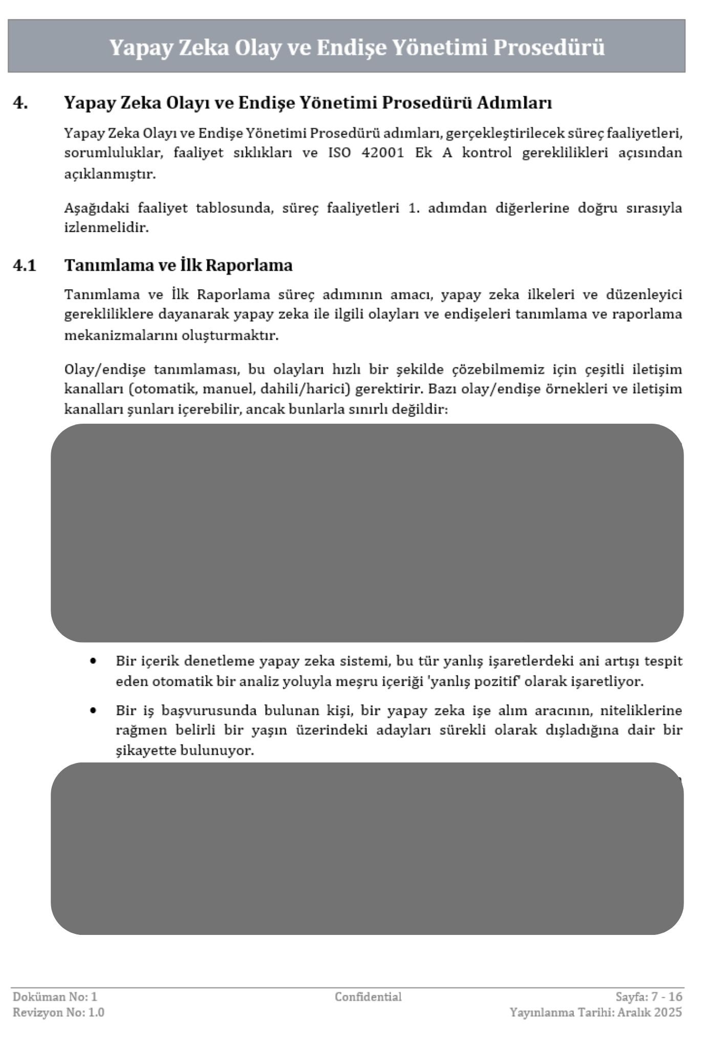 ISO 42001:2023 standardı gereksinimlerine göre kuruluş içinde etkili bir yapay zeka yönetim sisteminin uygulanmasına yardımcı olan 15 prosedür içermektedir.