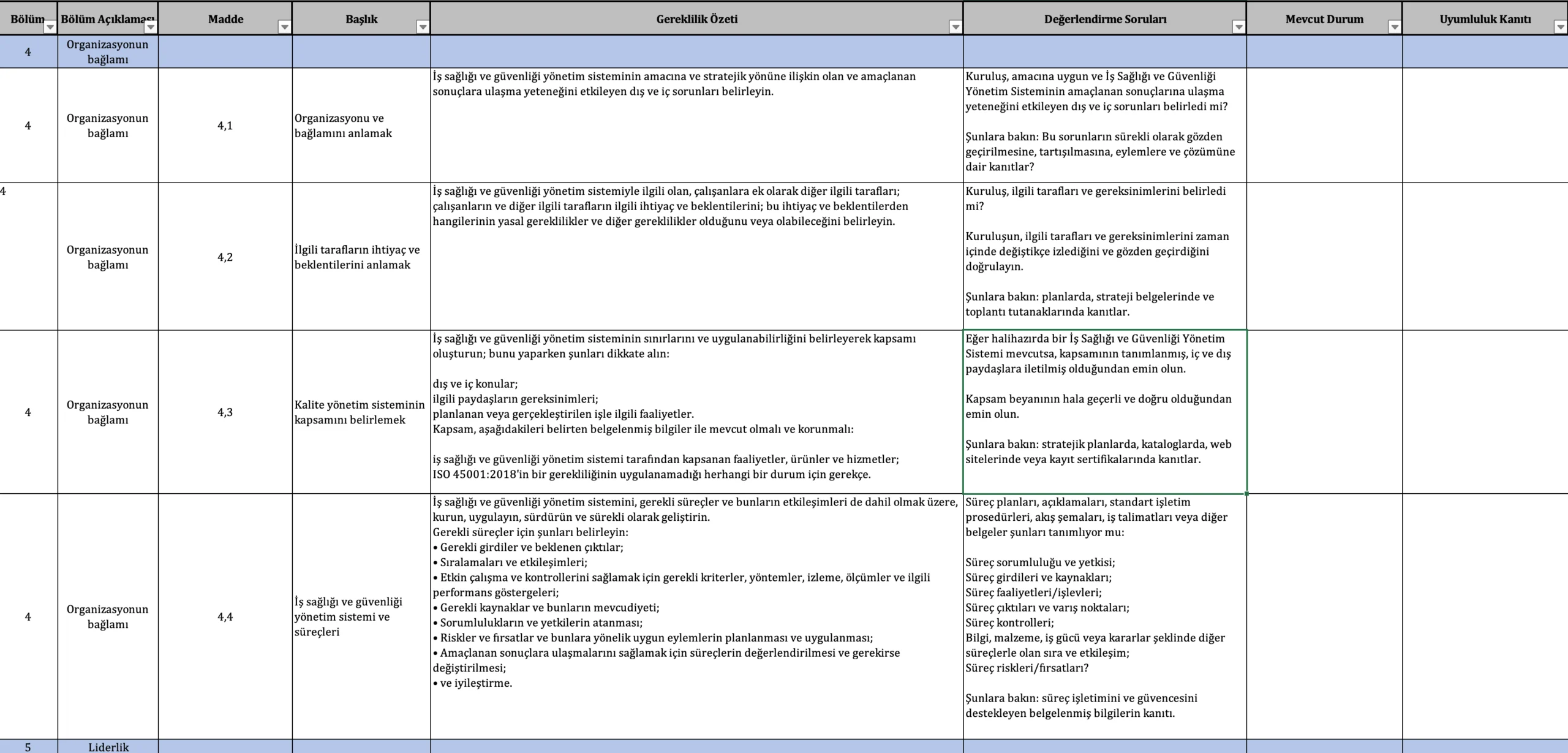 ISO 45001 – İç Denetim Soru Listesi Excel – Türkçe