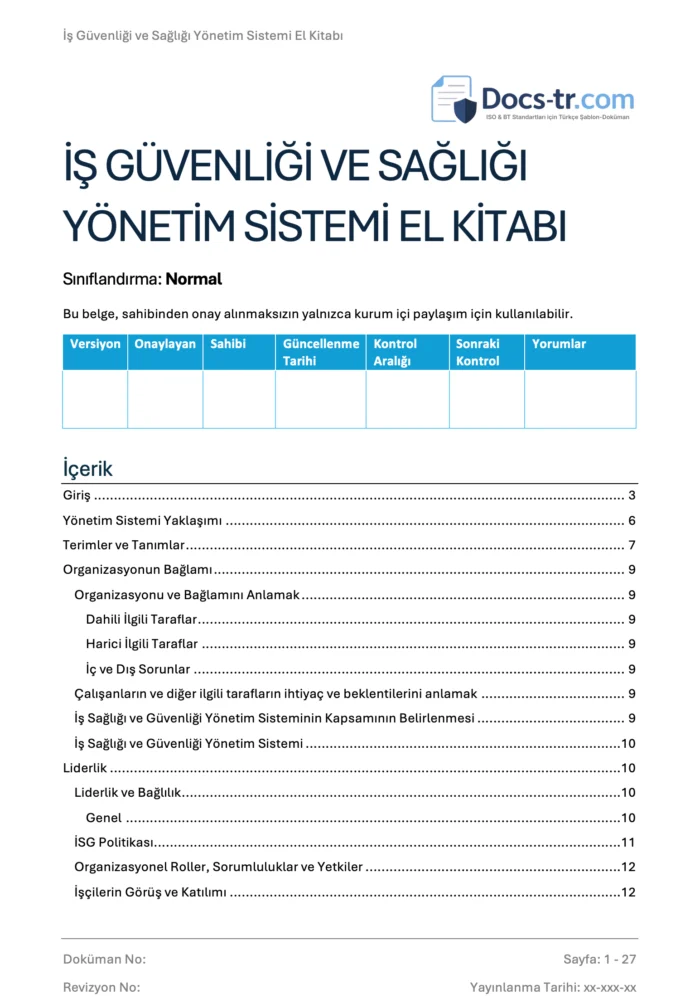 ISO 45001 İş Sağlığı ve Güvenliği Yönetim Sistemi İSGYS El Kitabı Word indirilebilir dokümanlar. Standarda uygun rehber, şablon ve örneklerle kolay uygulama.